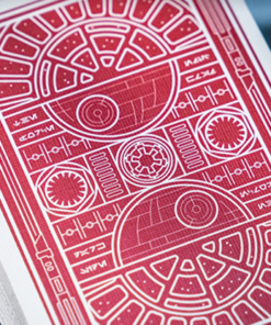 Across the red back design, it’s all about the details – from the Death Star to the First Order, Sith, and Empire insignia. In the center, a repeating pattern of TIE fighters supports Darth Vader’s lightsaber on either side.