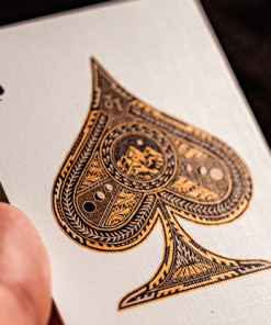 Wayfarers’ tuck box speaks for itself. It is peppered with luxurious touches, including two types of foils – liberally applied to the exterior and interior of the tuck box. Each foil is stamped heavily, utilizing embossing techniques which provide a texture that has to be felt in person to be truly appreciated. As you run your fingers over the surface of the tuck box, you will feel every raised surface, and every Wayfarers is anointed with a tax stamp style seal, complete with a perforation, allowing you to open your new deck with ease and without damage.
